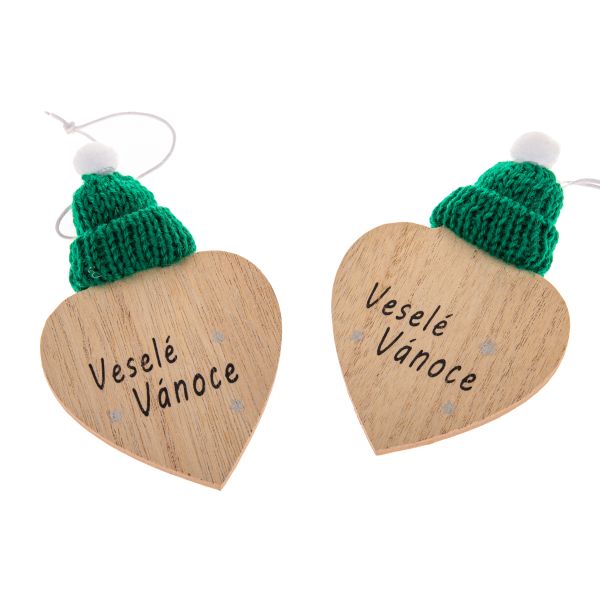 Dřevěné srdce s čepičkou "Veselé Vánoce", sada 2ks, 12/144
