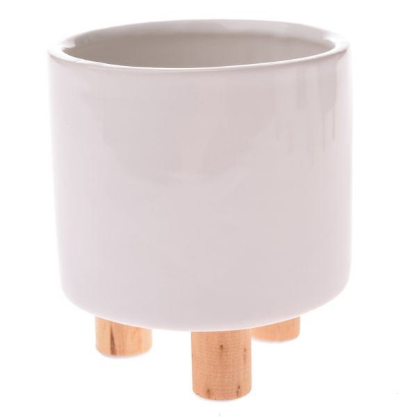 Ceramic pot with wooden stand, white, 0/24