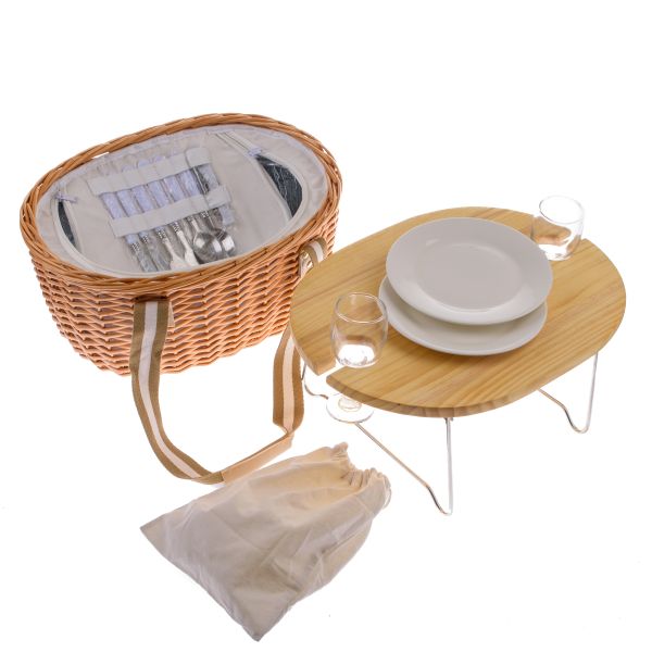 Willow picnic basket with wooden lid/table for 2 people, with cooler bag, 0/2