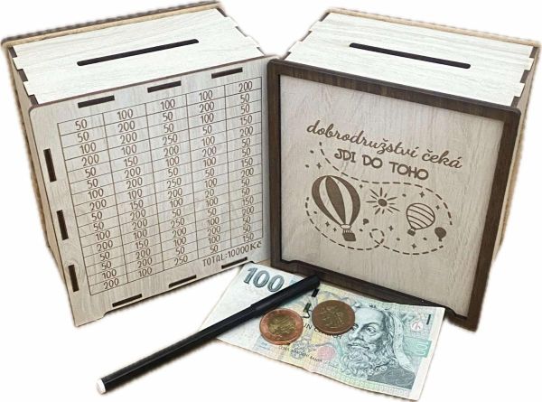 "Dřevěná pokladnička se škrtacím polem - ""Dobrodružství čeká"", 0/6"