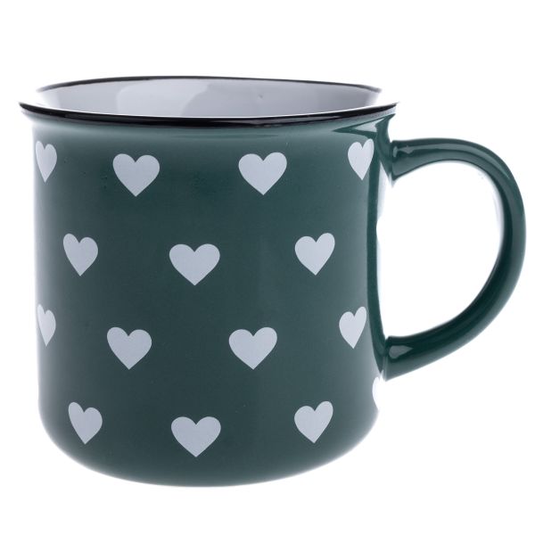 Keramický hrnek, zelený s bílými srdíčky, 400ml, 12/36