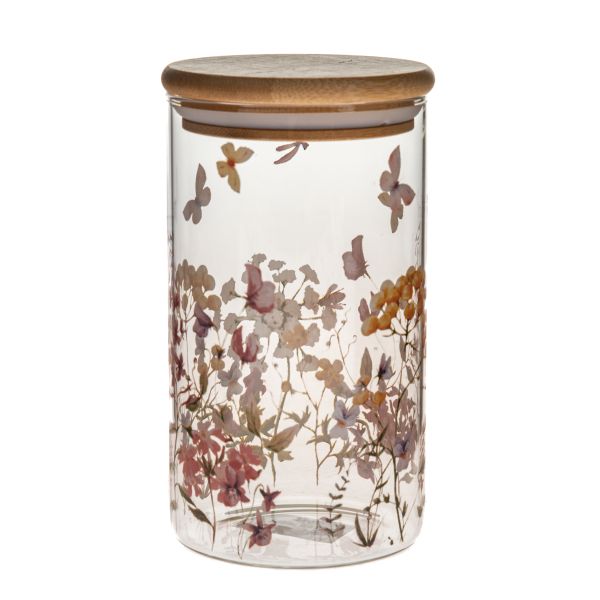 Skleněná dóza s bamusovým víkem - květiny, 670ml, 0/24