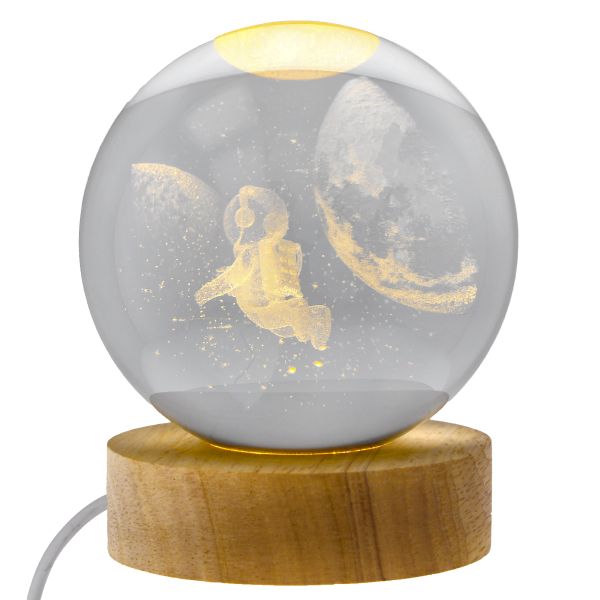 Svítící LED skl. koule na dřevěném podstavci s USB ø 8 cm, 1/36